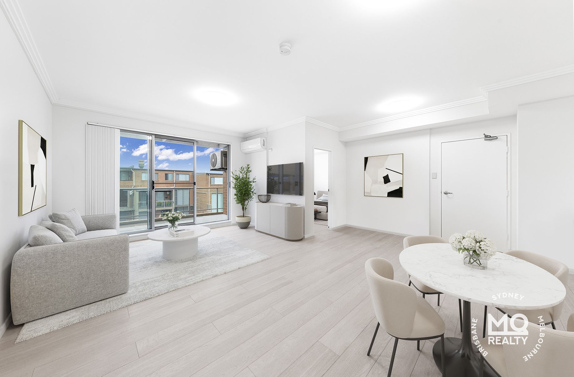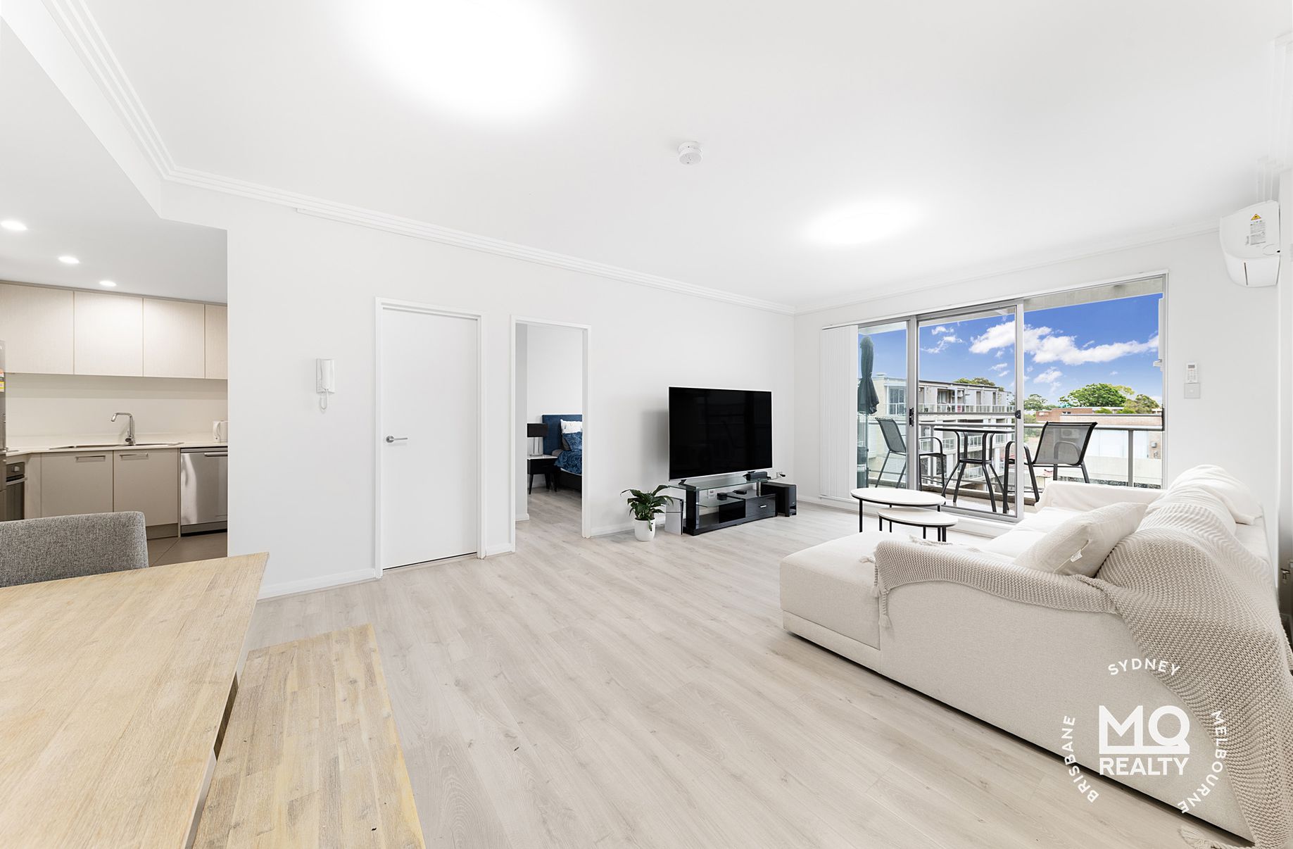 -Sunlit open-plan living and dining area with elegant timber floorboards, seamlessly flowing onto a private balcony.