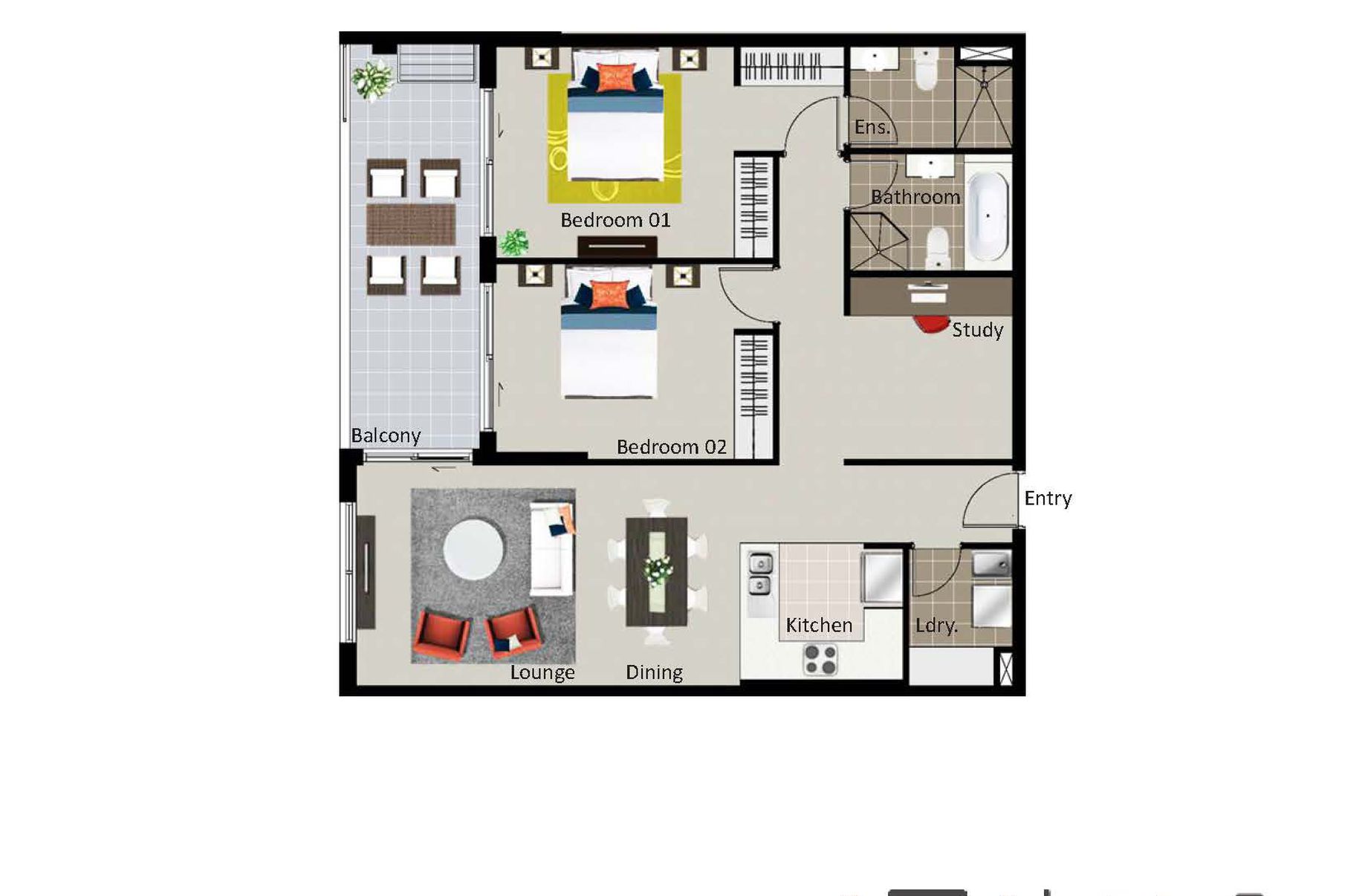 • 2 generous bedrooms with built-in wardrobes (main with ensuite) + Bedroom Size Study