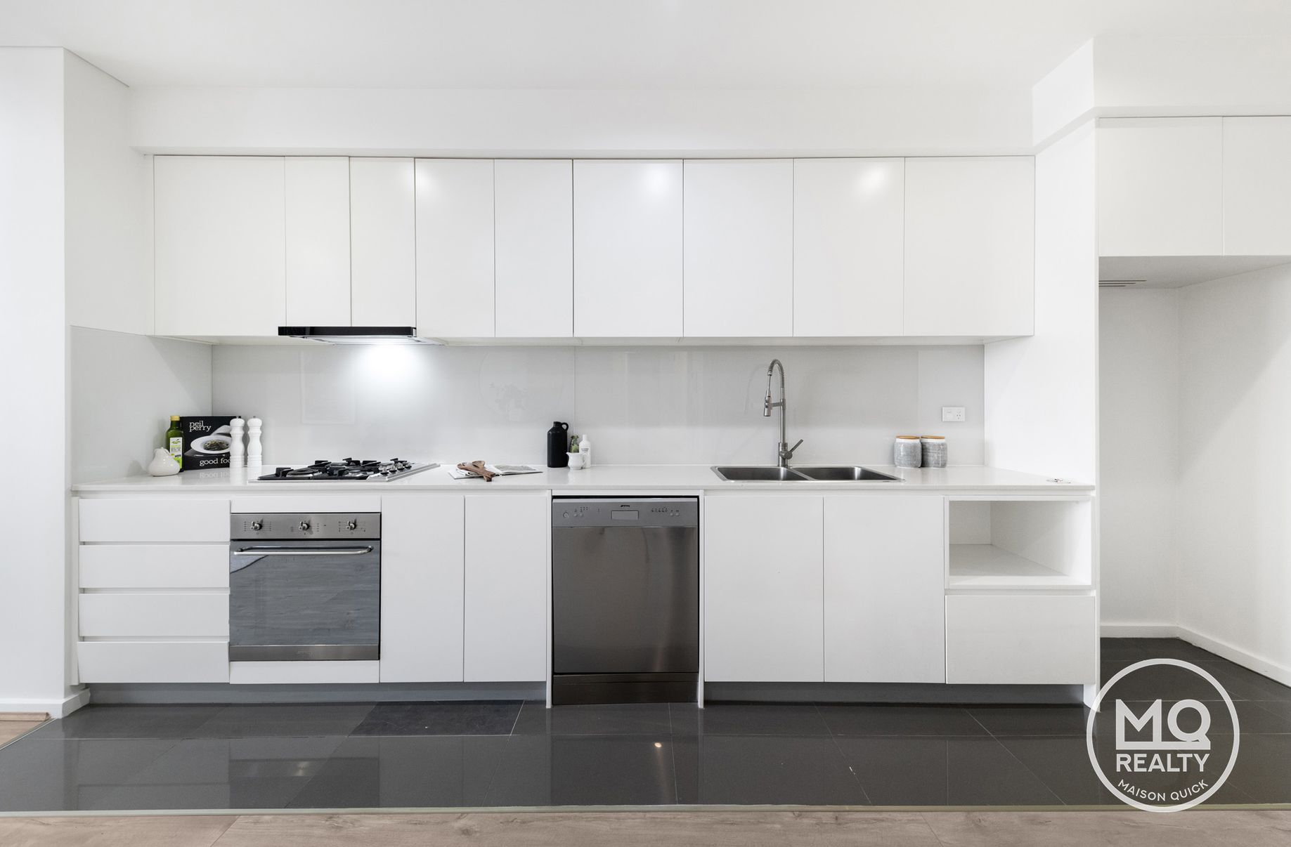 • Contemporary kitchen with sleek stone benchtops and premium Smeg stainless-steel appliances including gas cooktop, oven, and dishwasher.